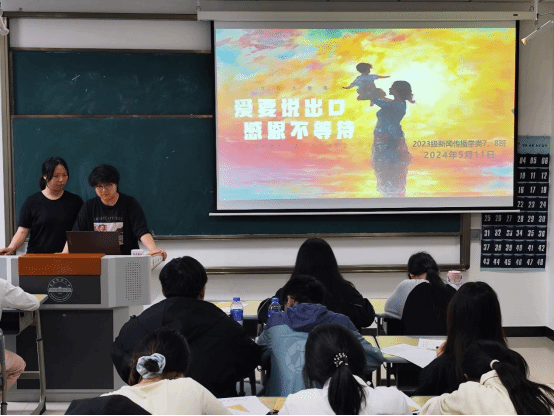 “同學(xué)們,猜一猜明天是什么節(jié)日???”“母親節(jié)!”5月11日,新聞傳播學(xué)類專業(yè)2023(7)、(8)班在K202教室開展以“愛要說出口,感恩不等待”為主題的團建活動。活動開始前,活動負責(zé)人、新聞傳播學(xué)類專業(yè)2023(7)、(8)班的班長楊雨霏、朱研溪提前為每位同學(xué)準(zhǔn)備好信紙和信封。朱研溪說:“我們希望通過寫信這種傳統(tǒng)而深情的溝通方式,讓同學(xué)們勇敢表達自己的心聲,將對母親的愛訴說于筆尖。”學(xué)生們觀看一段關(guān)于母愛的感人短片后,...